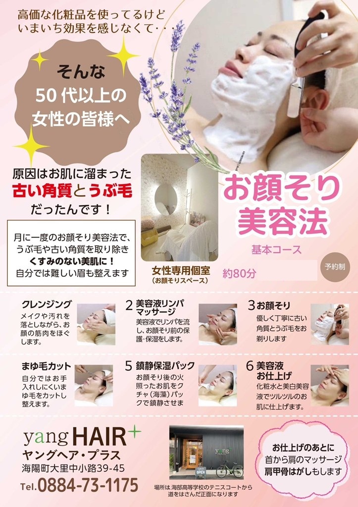 女性専用個室で、「お顔そり美容」「アロマリンパマッサージ」「肩甲骨剥がし」をしています。